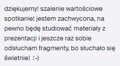- Odpowiedzi na pytania uczestników, które były rewelacyjne i znacząco poszerzyły temat!