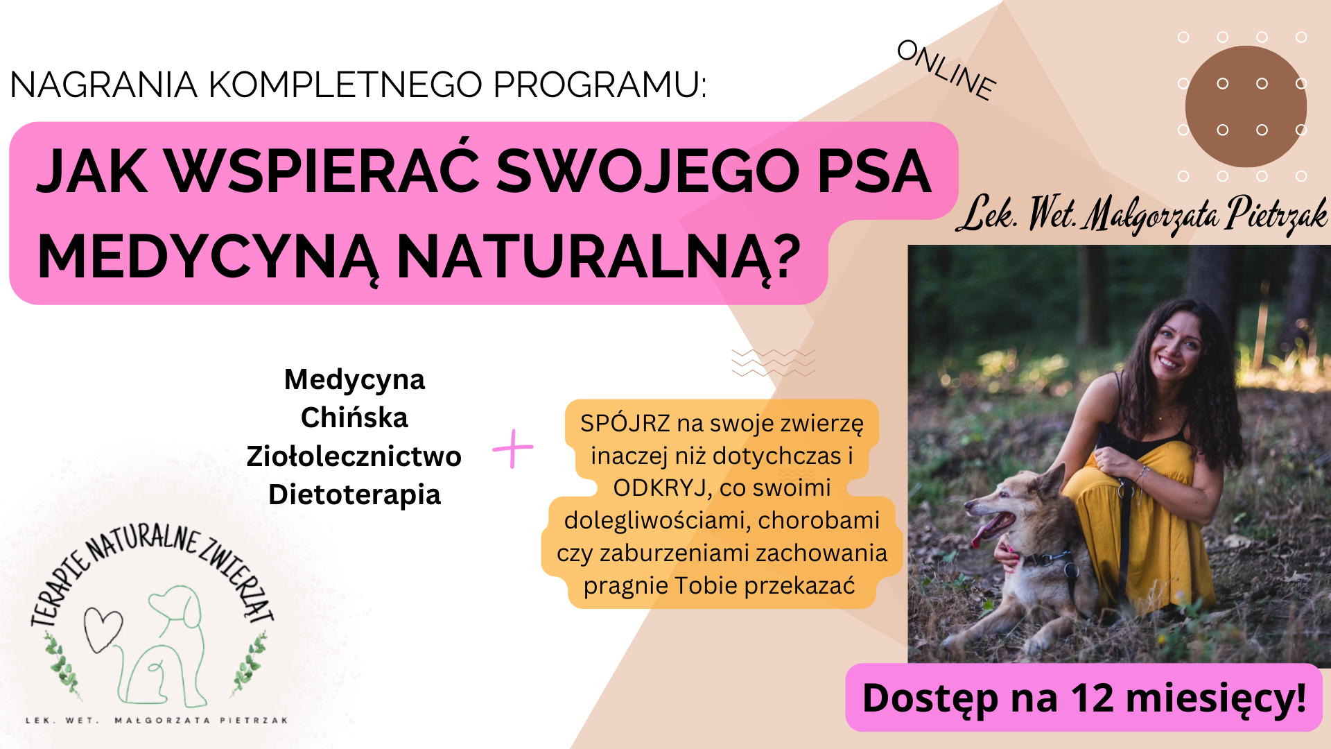 Oto Nagranie Kompletnego Programu, który nauczy Cię stosowania Medycyny Naturalnej u Twojego psiaka - poznasz medycynę chińską, wspierające składniki diety, zioła, elementy psychobiologii, a wszystko po to, by Twój pies…